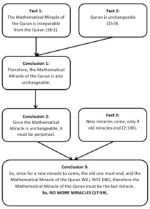 Puisque le Miracle Mathématique du Coran est basé sur des multiples de 19, il est intéressant de noter que ce flux logique comporte également des multiples de 19. Le flux logique utilise trois faits distincts pour parvenir à deux conclusions à partir desquelles une conclusion finale émerge. Les faits sont la sourate 38, verset 1 ainsi que la sourate 15, verset 9, et la sourate 2, verset 106. L’addition de tous ces nombres de sourates et de versets nous donne 171, qui est un multiple de 19, ou 19×9, et c’est aussi la valeur géométrique du nom d’Alban Fejza qui a découvert que le Miracle Mathématique du Coran est le dernier miracle jusqu’à la Fin du Monde.